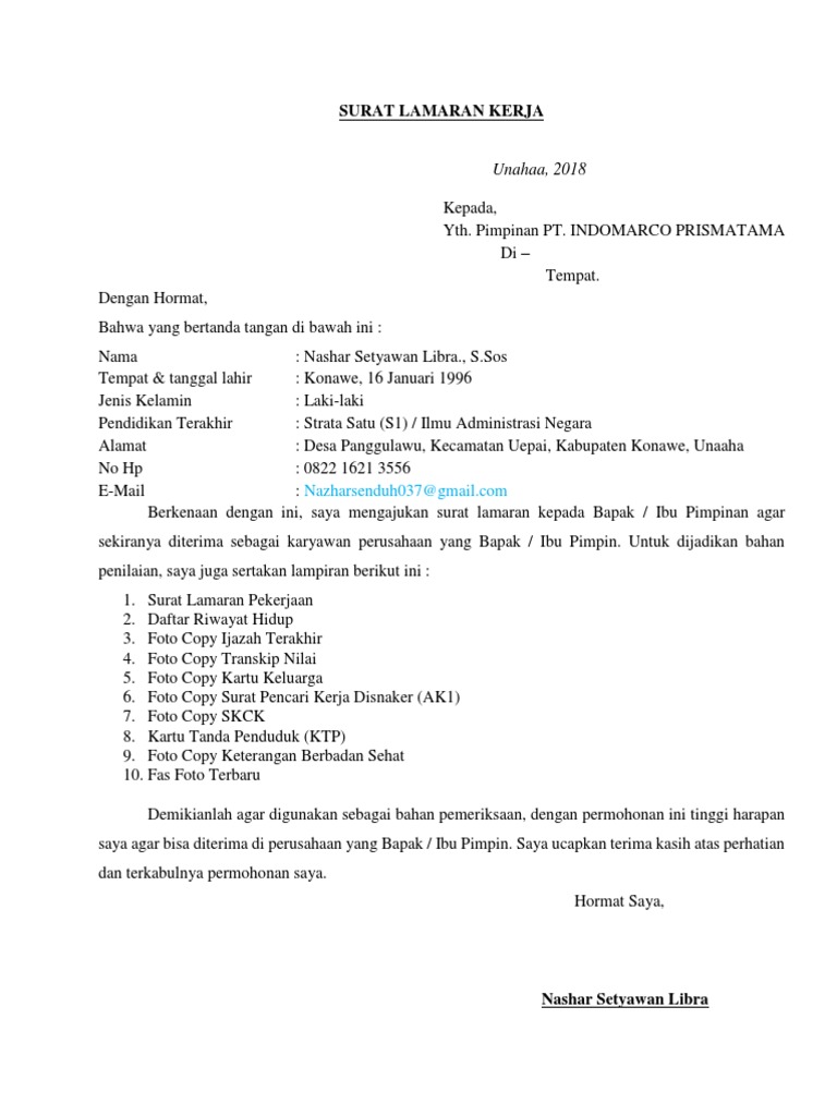 ⭐ dapatkan contoh surat lamaran kerja berbagai profesi paling lengkap !! Lowongan kerja indomaret updated : Tujuan utama dari surar lamaran kerja adalah agar dapat diterima dan dipertimbangkan oleh hrd atau pimpinan perusahaan. Itulah contoh surat lamaran kerja alfamart dan indomart yang dapat kami sediakan pada kesempatan kali ini. Documen dalam surat lamaran kerja Terhitung sejak penandatangan kontrak kerja ini. Akan tetapi persaingan dalam mendapatkan pekerjaan juga sangat ketat. Berikut contoh surat lamaran pekerjaan terbaru 2020 resmi yang baik dan benar dengan format formal yang bisa anda unduh untuk melamar di perusahaan bumn. ⏩anda bisa mendownload ⏩file nya dalam format ⏩doc. Maka dalam pembuatan contoh ini. Contoh surat lamaran kerja bahasa inggris contoh surat lamaran kerja dalam bahasa inggris dan artinya untuk fresh graduate yang baik dan benar terbaru 2018 untuk hotel sekretaris accounting guru via email. Untuk bisa diterima bekerja di indomaret tentunya harus membuat surat lamaran terlebih dahulu. Yang mana baik contoh surat lamaran pekerjaan tahun 2021 ini anda tulis tangan atu pun dengan ketikan komputer.