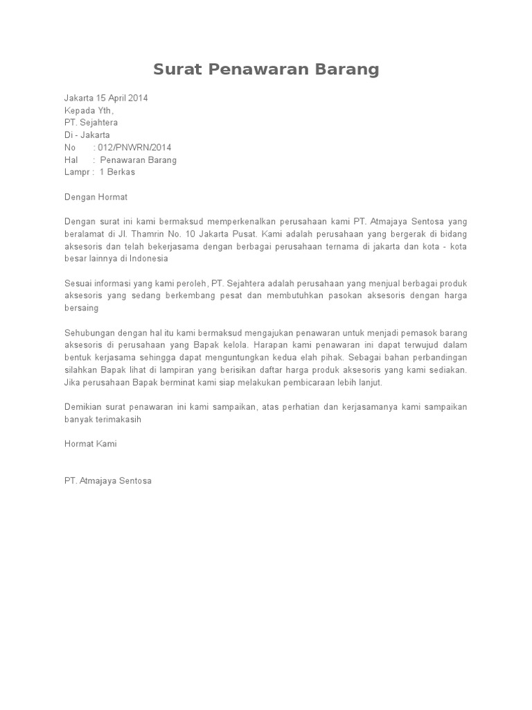 Contoh surat penawaran barang furniture untuk perusahaan; 1 berkas dengan hormat dengan surat ini kami bermaksud untuk memperkenalkan perusahaan kami pt. Atas perhatian dan kerjasamanya kami ucapkan terimakasih. Surat ini berfungsi sebagai bentuk penawaran kerjasama yang bisa menguntungkan kedua belah pihak. Apalagi, surat penawaran ini tergolong dalam kategori surat resmi yang memang harus diperhatikan dengan benar penulisannya. Yuk, simak saja penjelasan di bawah ini! Dibawah ini ada bebrerapa contoh dari surat penawaran baik barang, jasa dan kerjasama: Contoh surat permintaan barang yogyakarta, 19 april 2011 nomor: Dalam hal ini pelaku bisnis tentu saja bisa menggunakan surat penawaran jasa ke berbagai pihak. Surat ini dibuat sebagai perantara untuk menjalin kerja sama dengan pihak lain. Isi surat penawaran lazimnya akan tertera dengan jelas mengenai barang atau jasa yang ditawarkan termasuk degan rincian harganya. Contoh surat penawaran surat penawaran merupakan surat yang dibuat untuk menjalin sebuah kerjasama atau menawarkan barang jasa pada suatu perusahaan ke perusahaan lainnya. Contoh surat penawaran barang berikut ini adalah hal yang perlu untuk diketahui oleh pengusaha yang ingin menawarkan barang/jasanya.