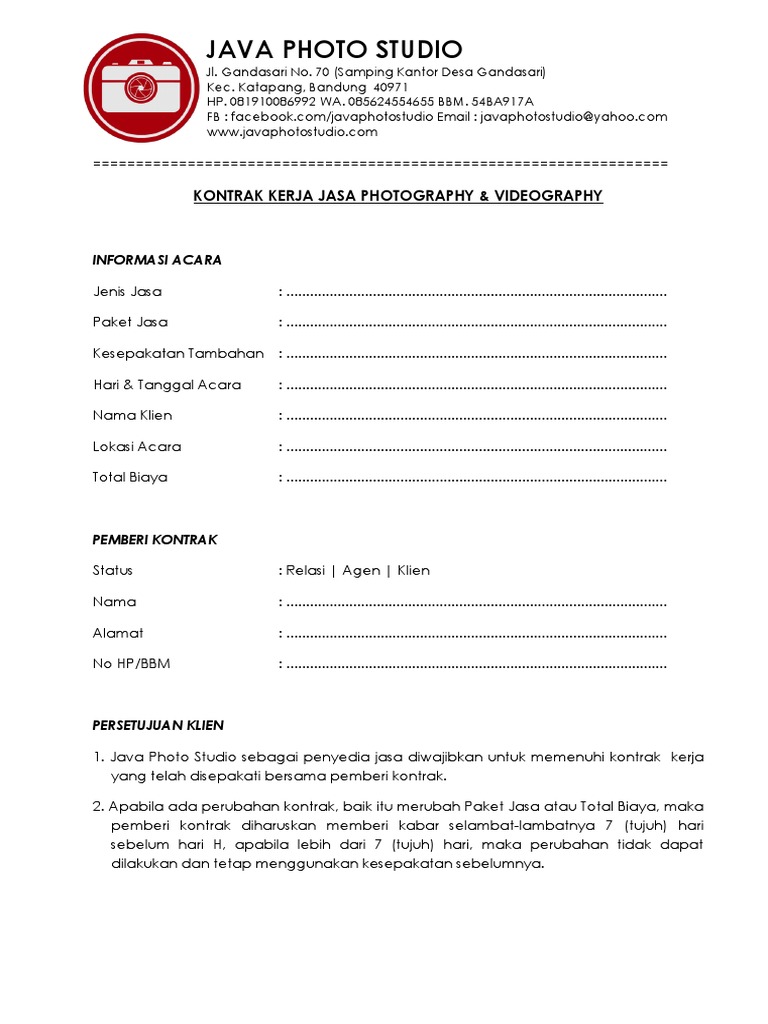 Contoh Surat Perjanjian Kerjasama Fotografi from imgv2-1-f.scribdassets.com Contoh surat penawaran jasa fotografi. Contoh surat perjanjian kerjasama fotografi. Kedua belah pihak sepakat guna tidak menggunakan jasa karyawan dalam menjalankan usaha tersebut. Sesuai dengan namanya surat perjanjian merupakan surat yang digunakan untuk mengikat perjanjian atara kedua belah pihak. Contoh surat perjanjian kerjasama perusahaan. Itulah contoh surat kerjasama yang juga dapat anda gunakan sebagai contoh surat perjanjian kerjasama usaha perorangan atau contoh surat perjanjian. Contoh surat perjanjian kerjasama di berbagai bidang. Contoh surat perjanjian kerjasama dalam bisnis jasa usaha dan investasi bila saat ini anda sedang atau mau menjalin sebuah usahabisnis dengan rekanteman anda maka buatlah sebuah perjanjian tertulis.