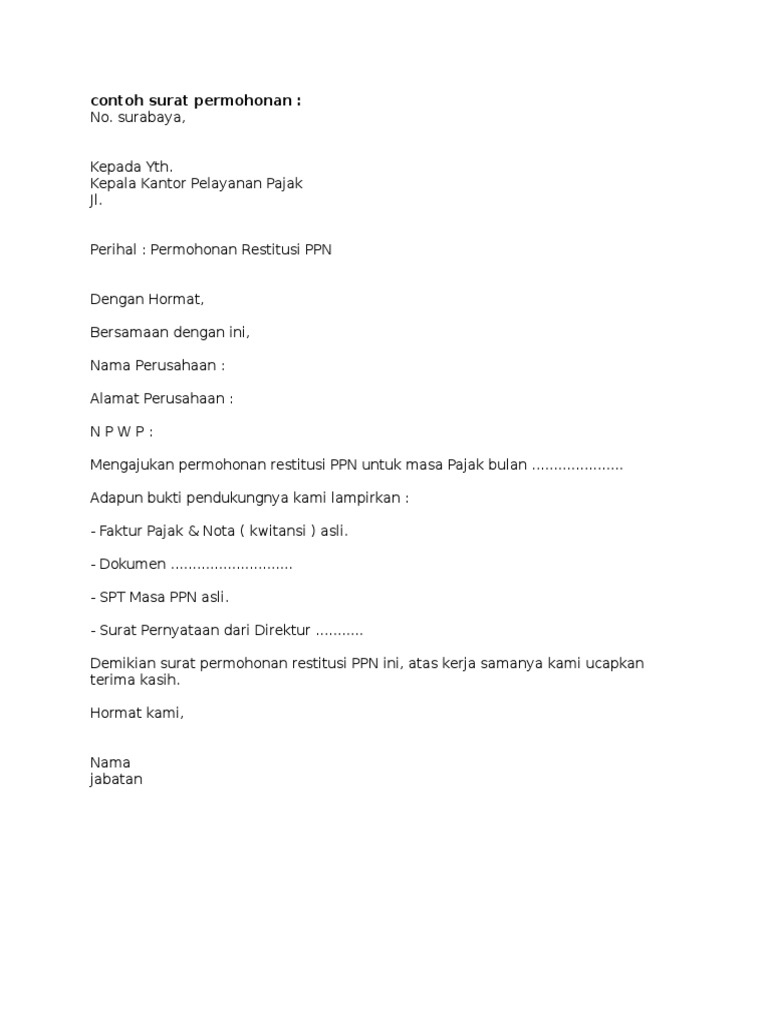 Contoh surat permohonan nomor faktur pajak download contoh surat permohonan nomor faktur pajak download format surat lain: Semua contoh surat menyurat ini biasanya akan diarsipkan oleh perusahaan tertentu. Terkadang, kami juga ditugaskan untuk membuat surat jawaban dari surat resmi klien. Pencarian informasi secara formal selalu membutuhkan surat resmi. Pada dua tahun pertama saya masuk kerja di perkantoran, ada satu tugas yang sering didelegasikan ke kami, para pegawai muda.